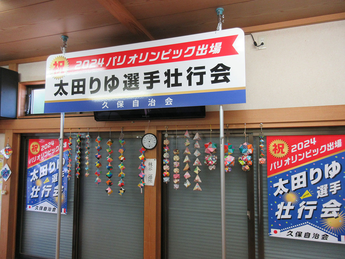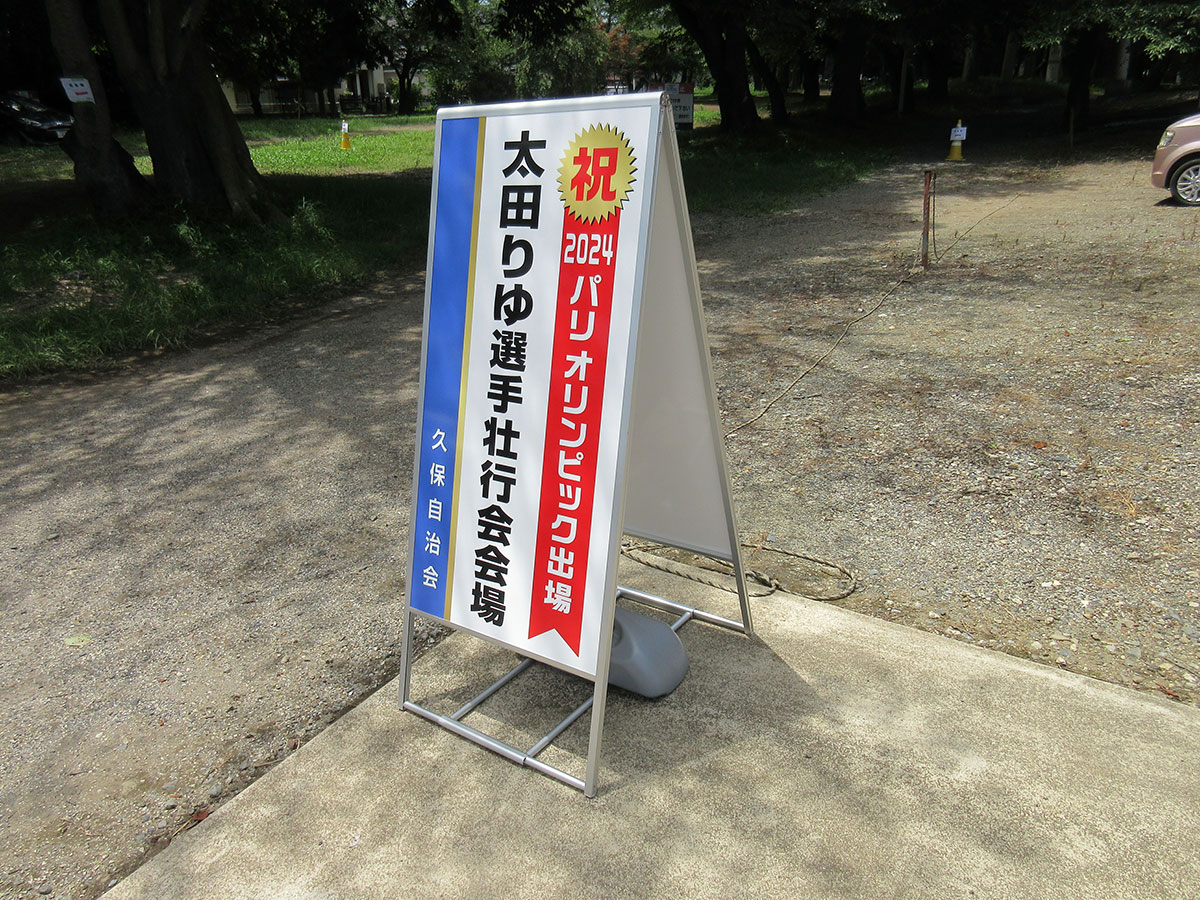 地元の活躍している選手を応援するようなイベントでは、ステージを飾る看板が不可欠です。きちんと力の入ったイベントであることが印象づけられ、写真に記録する際に重要な記録になります。応援ポスターも合わせて制作しました。屋外用インクジェットで塩ビのステッカーと合成紙に印刷したもので、ステージ看板は板に貼り合わせてあります。