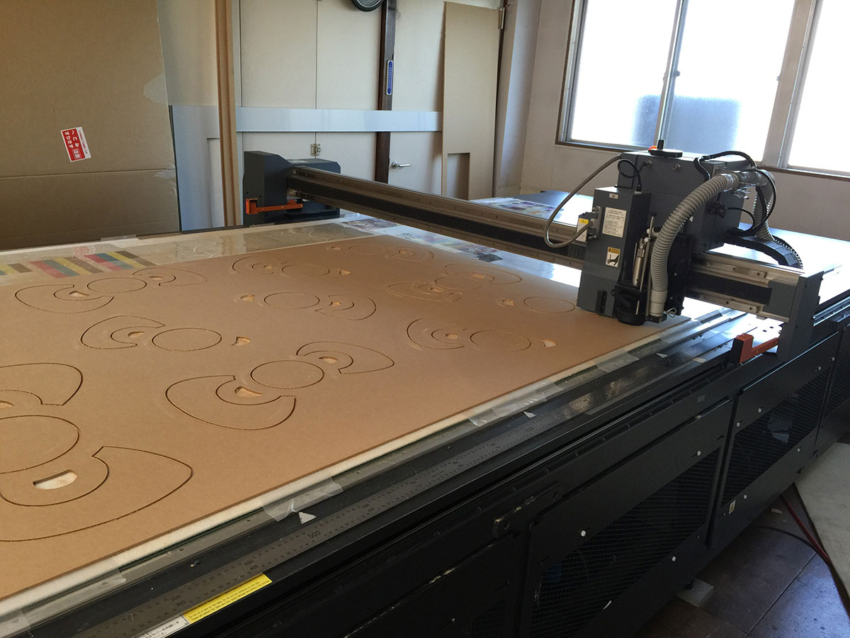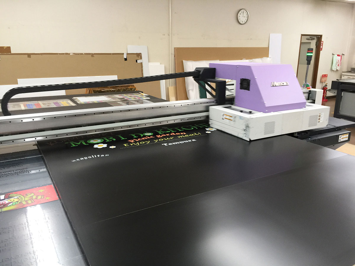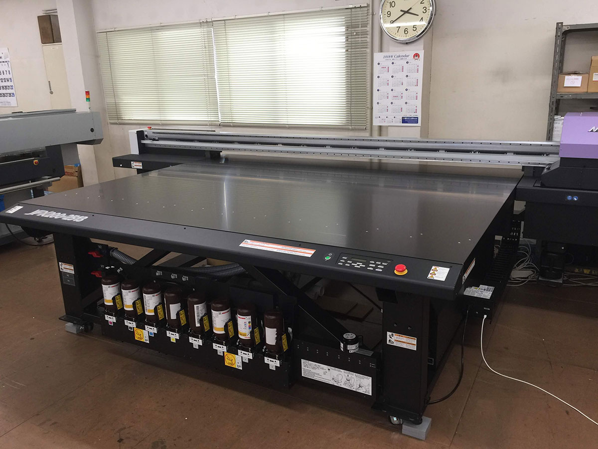 【MIMAKI JFX200-2513】幅2.5m×奥行き1.3mまでのメディアに、紫外線で硬化するUVインクでダイレクトにプリントできる特殊なプリンターです。硬化後は非常に硬く曲げると割れる性質があります(硬質インク)が、そのぶん薬品に強く、シルクスクリーン印刷や塗装との相性が良好です。JFX500に比べると低速ですが、そのぶん高画質で、品質を優先する高付加価値の製品に使用しています。