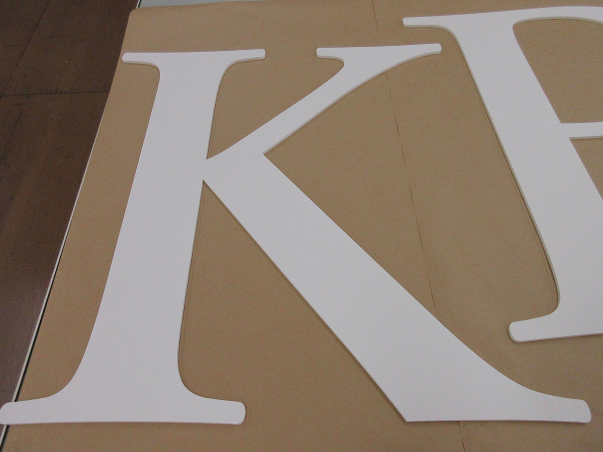カッティングプロッターにより、塩ビ板やアクリル板をカットし、大きな文字形状の切り抜きが可能です。これらを壁面などに貼り付け施工します。カルプと呼ばれる厚みのある貼り合わせ板をカットすることで、立体的なカルプ文字を切り抜くことも可能です。
