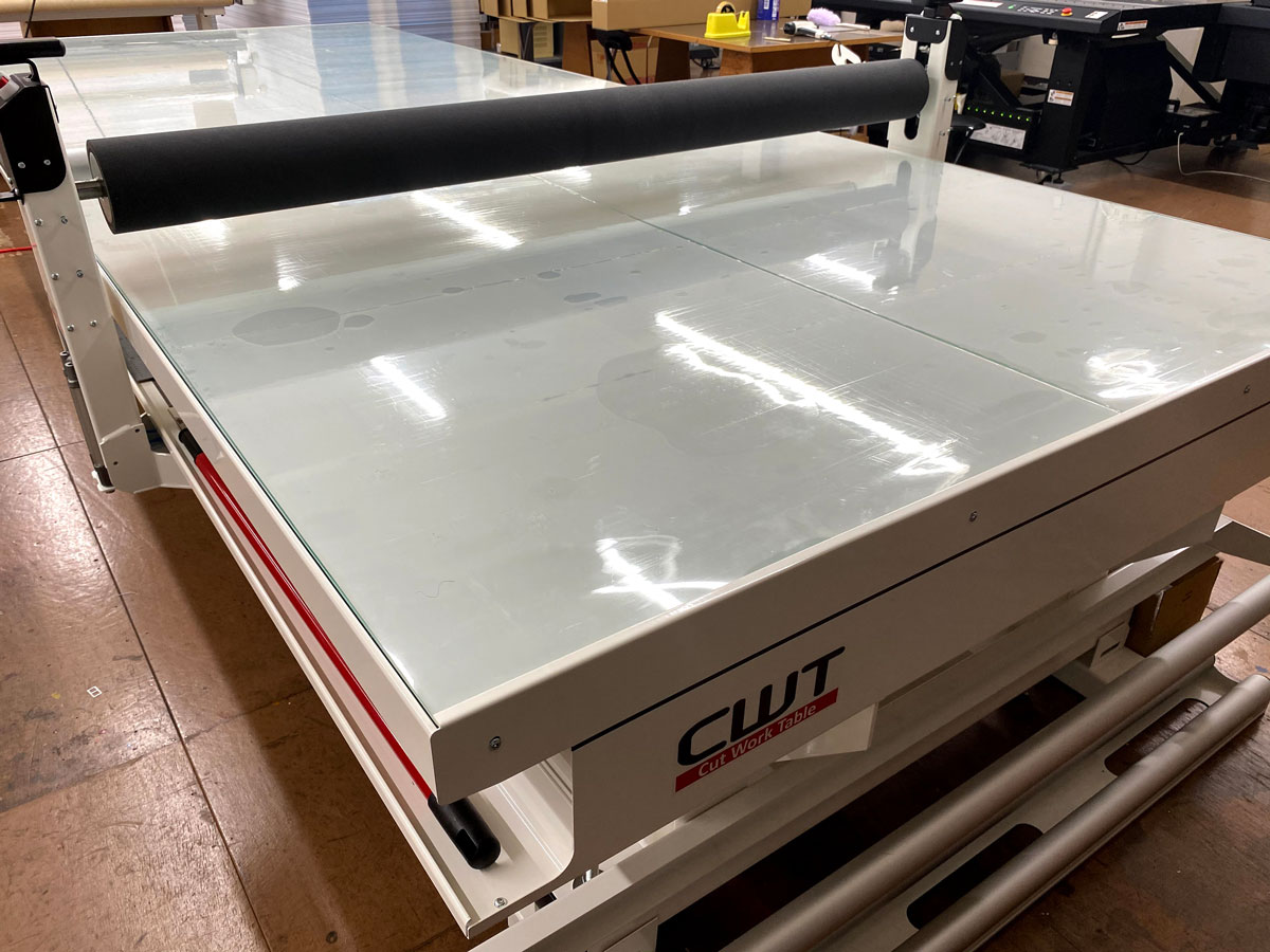 【MIMAKI CWT1640PA】幅1.6m×奥行き4.0mのテーブルを備えた、糊付きのメディアを貼り合わせるための作業テーブルです。熟練の職人でないと綺麗に貼り合わせることが難しい大判のメディアを、誰でも失敗なく貼り合わせられる、頼れる機械です。