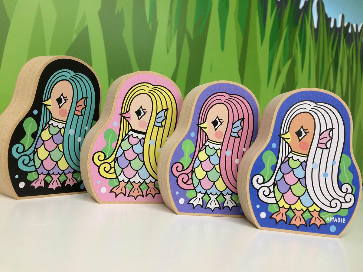 UVプリンタで制作したアイテムです。当社のフラットベッドカッティングプロッターで、厚みのある木材(MDF)のカットを行い、表面にUVプリンタで直接カラープリントしています。カラー形状に合わせて白いインクで下地もプリントしているため、美しい発色が可能です。