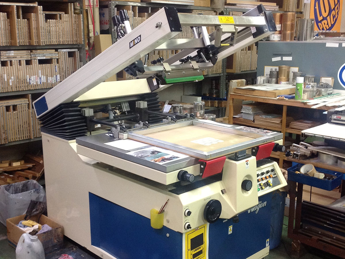 【江口孔版】1枚〜小ロットを印刷する際に用いるスクリーン印刷の手刷り印刷台。印刷対象を固定できるバキュームテーブルと、版を固定して上げ下げする機能を組み合わせたものです。力加減などには慣れが必要ですが、小回りの利く使いやすい設備です。