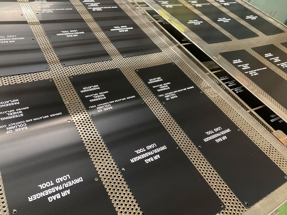 シルクスクリーン印刷にて、フラット形状の金属塗装品に印刷した事例。下地の黒は塗装で、塗膜の上に白で印刷しています。