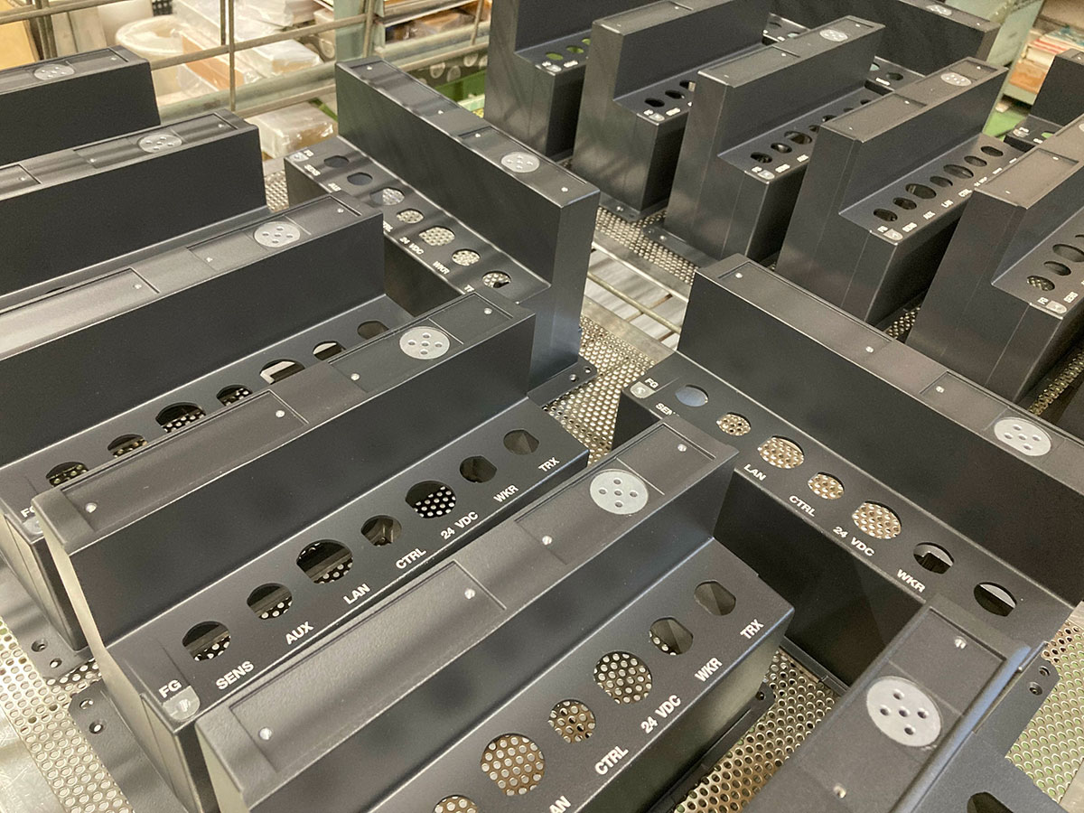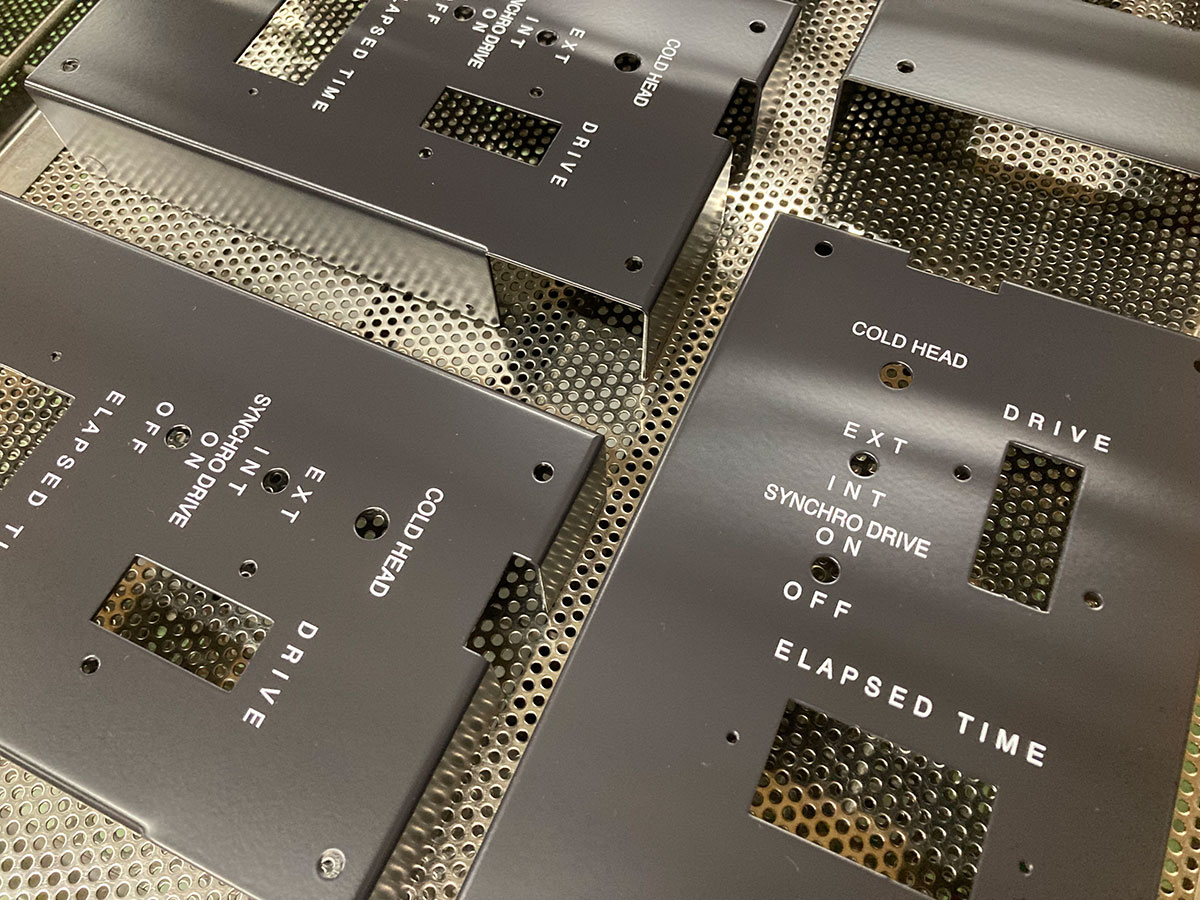 シルクスクリーン印刷にて、箱状に折り曲げ加工された金属パネルに印刷した事例。印刷時にしっかりと形状を支えられれば、立体的な形状にも印刷可能です。