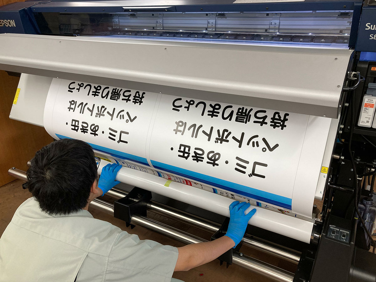 【EPSON SC-S80650】主に屋外で使用する印刷物に用いる、塩ビステッカー、ターポリン生地などに印刷するプリンターです。20m〜50mほど巻き付けられたロール状のメディアを使い、最大で幅1.6mまで印刷できます。