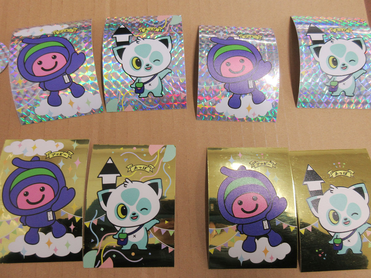 ホログラムシートやゴールドのシール材料に、UVプリンタで白+カラーインクでプリントしたキャラクターシールです。UVプリンタであれば、普通のシール・ステッカーだけでなく、こうした特殊な下地に対しても印刷が可能となります。