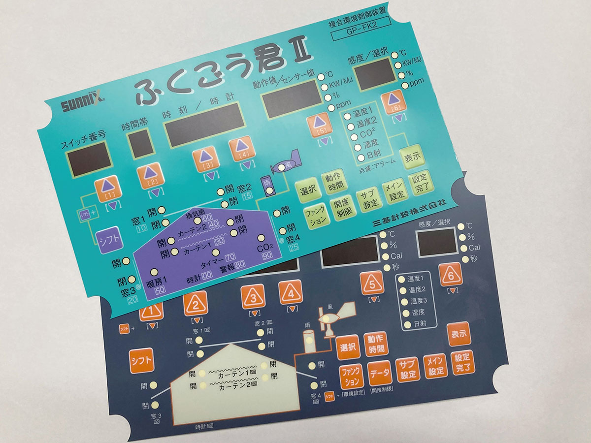 温室・ハウスの環境をコントロールする装置で使う操作シートです。通常、シルクスクリーン印刷で仕上げます。装置の操作パネルに、基板実装にて表示用の7セグメントやLED、押しボタン用のタクトスイッチが配置されますが、その表面を覆い、表示の意味を説明し、ボタンを機能的にし、美観を整えてくれるのがこの操作シート。エンボス加工(ボタンに凹凸をつける)やスモーク処理(LEDの光を拡散したり、機械部品の姿を隠す)、遮光、糊付けなど、ぱっと見た目以上に複雑な製品です。当社は金型を作らず低価格でエンボス処理する技術で、小ロットのシートに対応しています。