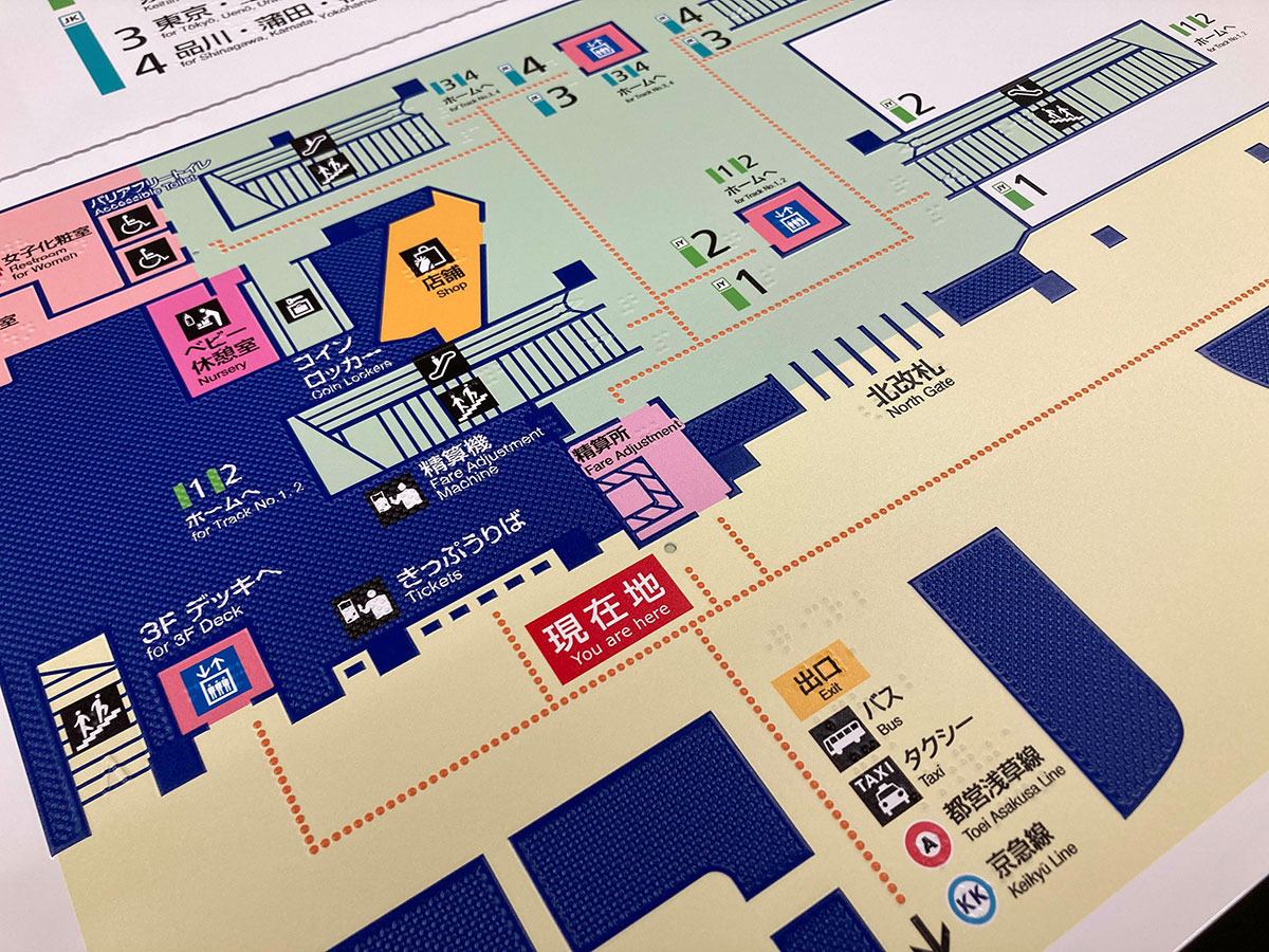 電車等の交通機関で使われる案内図は、様々な利用者に対応するため、触知案内図として作成されます。この案内図は真鍮の板で、エッチングとプレス加工によって立体形状になっています。それを塗装した板をお預かりし、当社でUVプリンタによりカラー部分をプリントしています。エッチング加工にぴったり合わせたプリントが必要で、非常に繊細な作業となります。プリント後、さらに専門業者でコーティング処理を行って完成です。