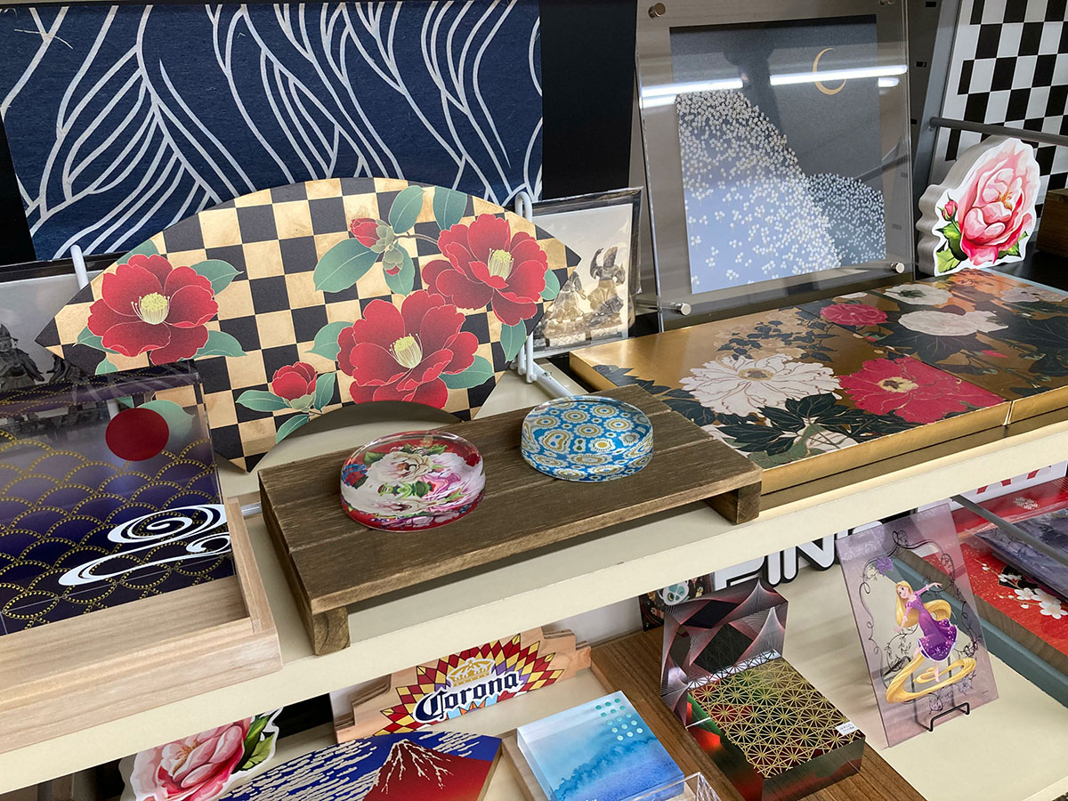 UVプリンタで制作したアイテムです。アクリルやガラスなどの透明感ある素材や、木材の木目、金・銀などの光沢や質感のある表面を生かし、それらの材料に直接プリントすることができるUV方式の応用で、美しい表現が可能となります。